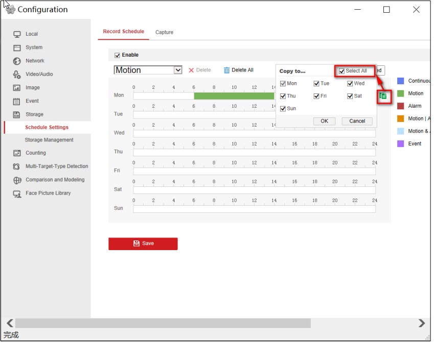 - Mở Storage-Schedule Settings (Cài đặt lịch lưu trữ), trong vùng màu đỏ bên dưới, có thể chọn loại video lưu trữ, chẳng hạn như Continuous/Motion/Alarm (Liên tục/Chuyển động/Báo động),…Ở đây chúng tôi chọn Continuous (Chuyển động).