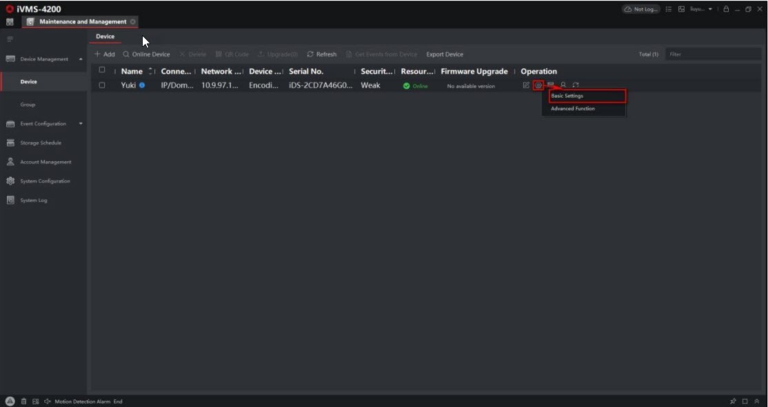 - Chạy phần mềm iVMS-4200, vào trang Device Management --> Device (Quản lý thiết bị --> Thiết bị), chọn thiết bị bạn muốn thiết lập và nhấp vào Basic Settings (Cài đặt cơ bản). Sau đó chọn Event --> Basic Event (Sự kiện --> Sự kiện cơ bản)