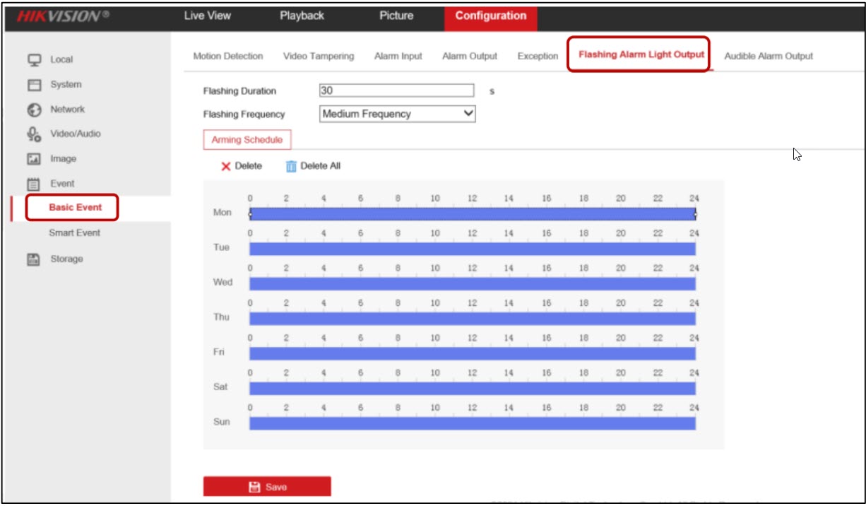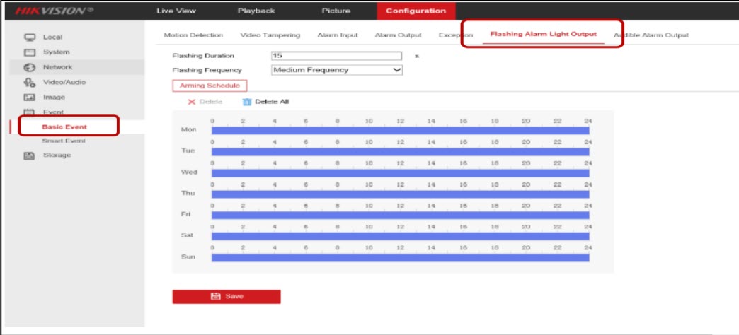 - Đăng nhập trang web NVR, vào Configuration > Event >Basic Event >Flashing Alarm Light Output (Cấu hình > Sự kiện > Sự kiện cơ bản >Cài đặt đầu ra đèn cảnh báo nhấp nháy) để đặt Thời lượng nhấp nháy và Tần suất nhấp nháy.