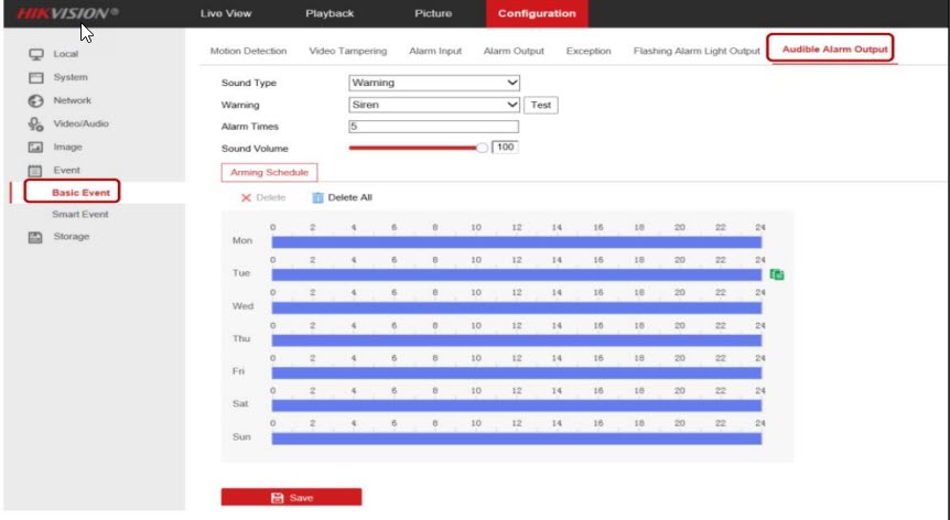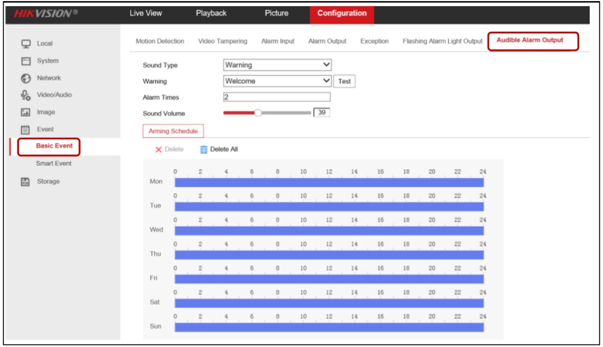 - Đến Configuration > Event >Basic Event >Audible Alarm Light Output (Cấu hình > Sự kiện > Sự kiện cơ bản > Cài đặt đầu ra đèn báo âm thanh) đặt Loại âm thanh và thời gian báo động.