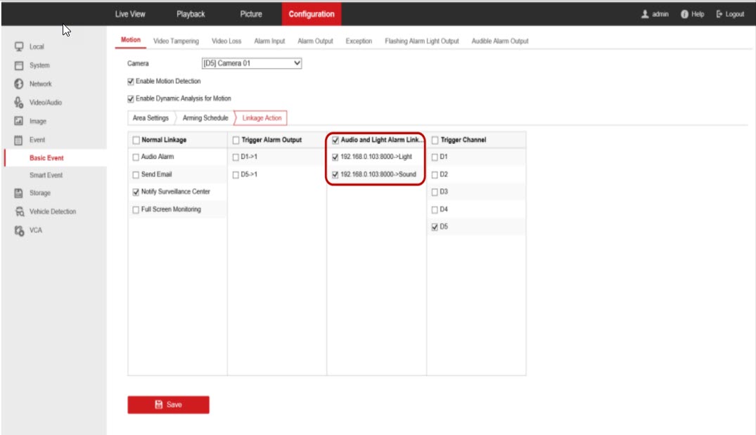 Trên trang Linkage Action (Phương pháp liên kết), tick vào hộp kiểm Notify Surveillance Center (Thông báo Trung tâm giám sát). Tick vào hộp kiểm Audio and Light Alarm Linkage (Liên kết báo động âm thanh và ánh sáng)