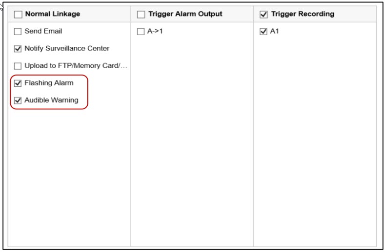 - Trên trang Linkage Action (Phương pháp liên kết), tick vào hộp kiểm Notify Surveillance Center (Thông báo Trung tâm giám sát). Tick vào hộp kiểm Flashing Alarm and Audible Warning Linkage (Liên kết báo động nhấp nháy và cảnh báo âm thanh)