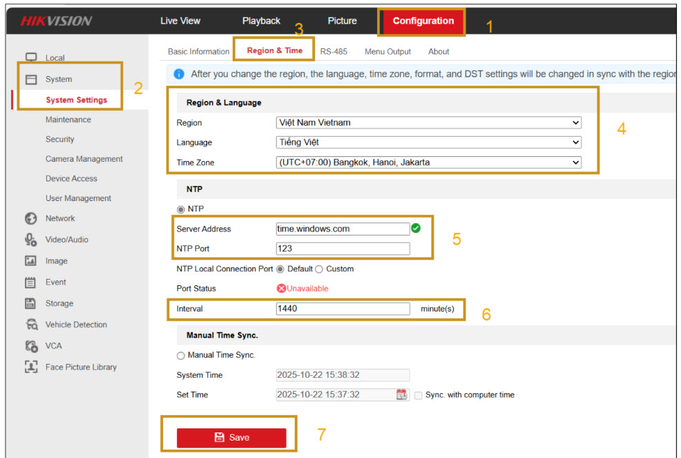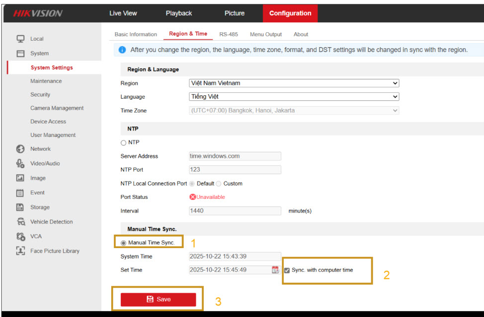 - Vào: Configuration → System → System Settings → Region & Time