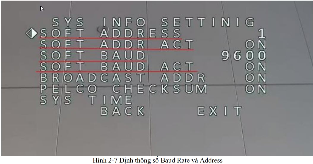 - Định thông số Address và Baud rate của Speed Dome trong hình 2-7, bạn cũng nên kích hoạt SOFT ADDR ACT và SOFT BAUD ACT. Soft Address là địa chỉ hợp lệ để kết nối với Speed Dome khi SOFT ADDR ACT là ON, có thể lựa chọn trong dải từ 0/1 (Pelco-D/P) đến 255. Soft Baud Rate là tốc độ truyền hợp lệ cho Speed Dome khi SOFT BAUD ACT được bật, với các tùy chọn là 2400, 4800, 9600 và 19200