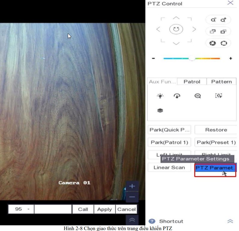- Như hình minh họa 2-8, click chọn PTZ Parameter Settings trên bảng điều khiển PTZ