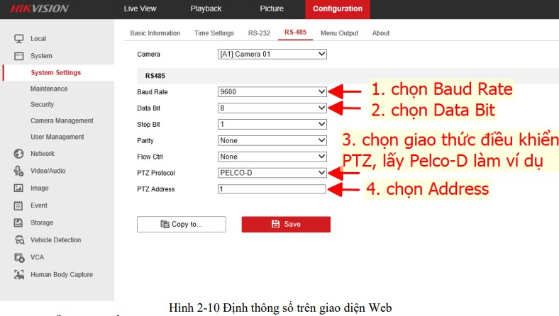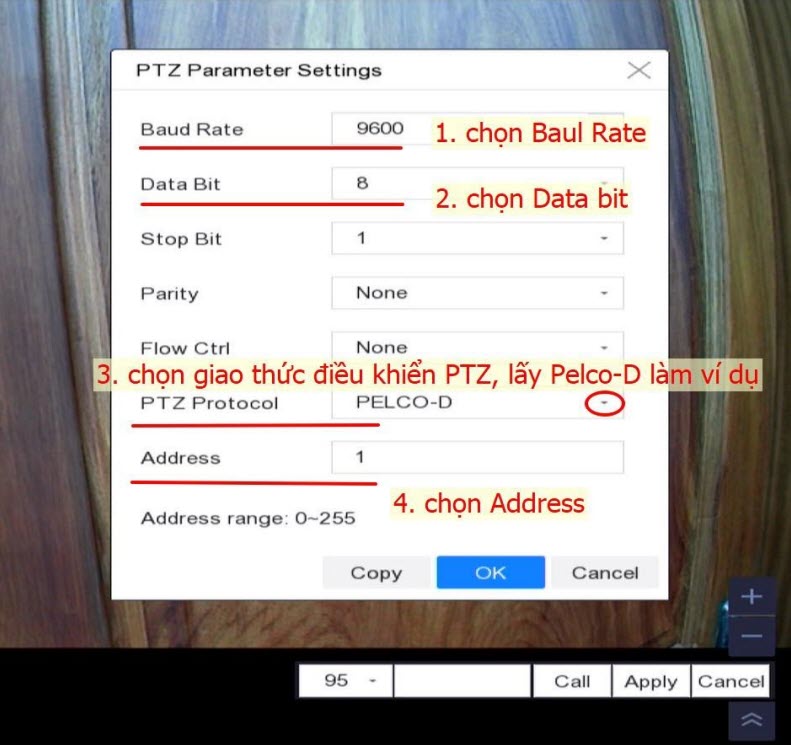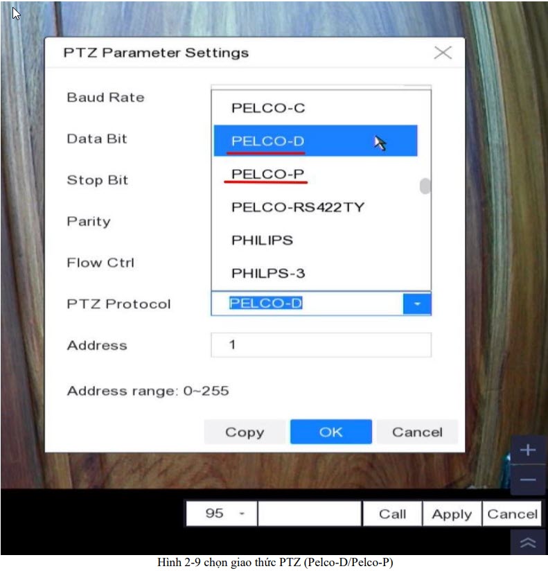 - Trong bảng điều khiển PTZ, định thông số của Baud Rate, Data Bit, PTZ Protocol và Address như hình 2-9