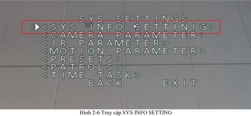 - Truy cập SYS SETTINGS trong Speed Dome bằng bước minh họa từ hình 2-5 đến 2-7