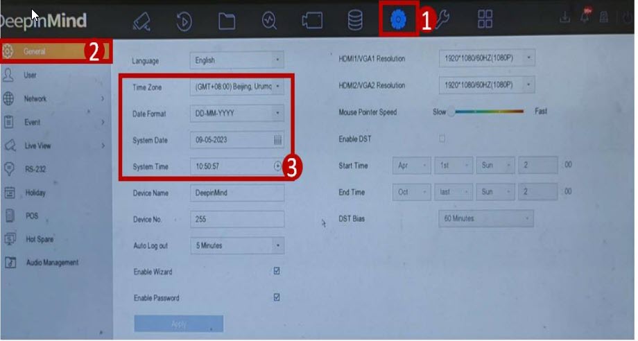 - Đăng nhâp thiết bi ̣qua màn hinh trực tiếp chọn ̣ Setting > General > Time Zone, System Date, System Time.