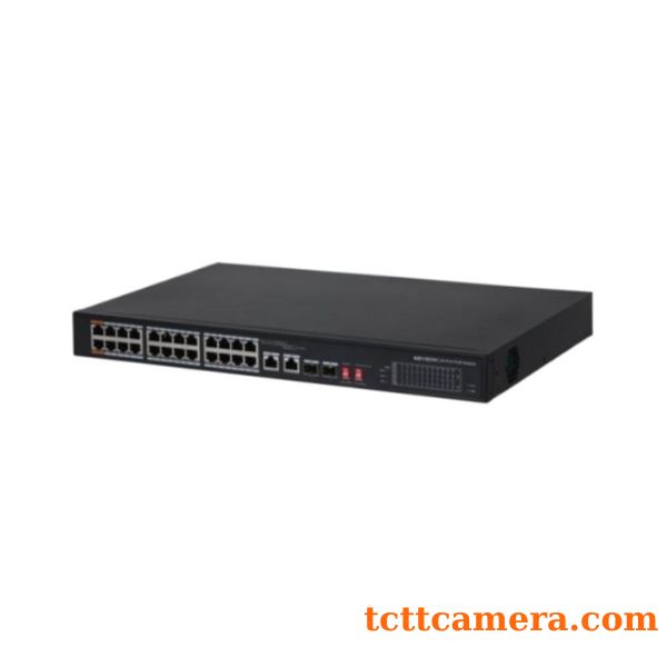 - 24 x 10/100Mbps PoE Ports + 2 SFP ports 1000Mbps + 2 port Uplink 1000Mbps (sử dụng 2 port quang hoặc 2 Uplink, không sử dụng đồng thời cả 4 port)