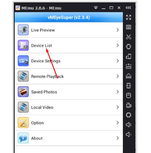 - Vào giao diện chính của phần mềm chúng ta chọn mục Device List để thêm camera vào phần mềm.