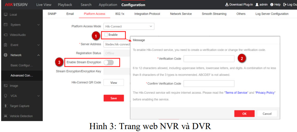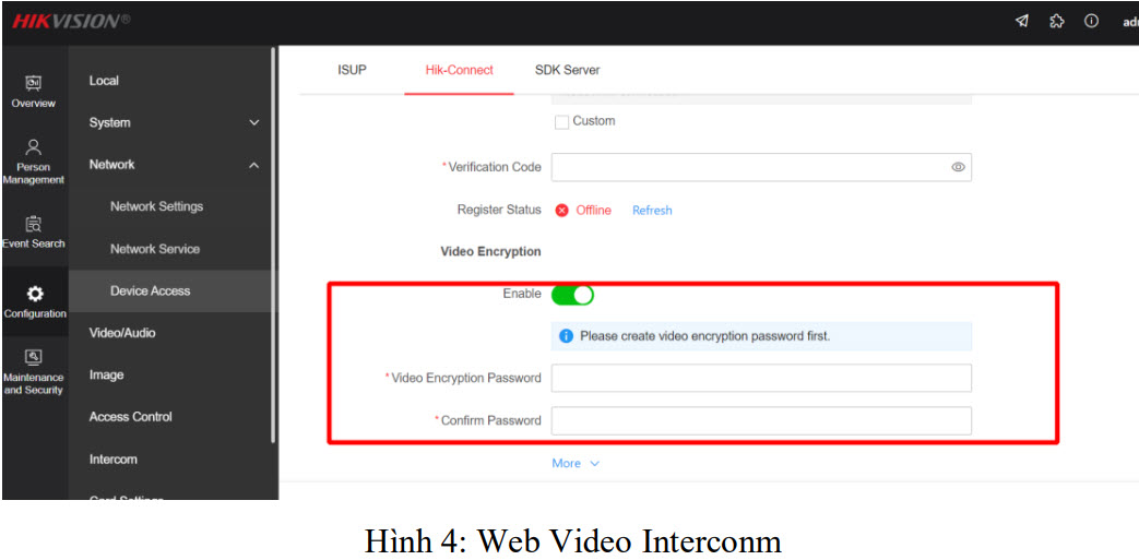 - Vào mục Configuration > Network > Device Access > Hik-Connect để bật chức năng Video Encryption, tại đây bạn có thể tự thiết lập mã hóa.