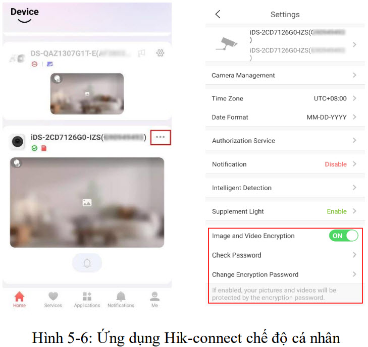 - Bạn có thể cấu hình chức năng mã hóa thông qua ứng dụng Hik-Connect. Sau khi thêm thiết bị thành công, chạm để vào Cài đặt thiết bị > bật/tắt Mã hóa hình ảnh và video