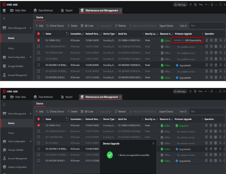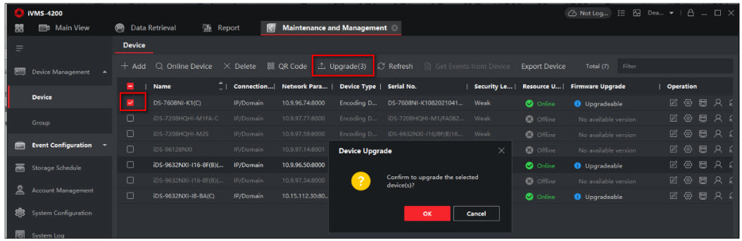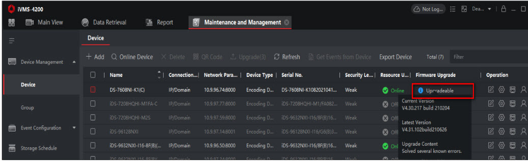 - 2. Kiểm tra trạng thái nâng cấp Firmware trong Maintenance and Management --> Device Management --> Device (Bảo trì và quản lý --> Quản lý thiết bị --> Thiết bị), iVMS-4200 sẽ hiển thị phiên bản mới nhất.