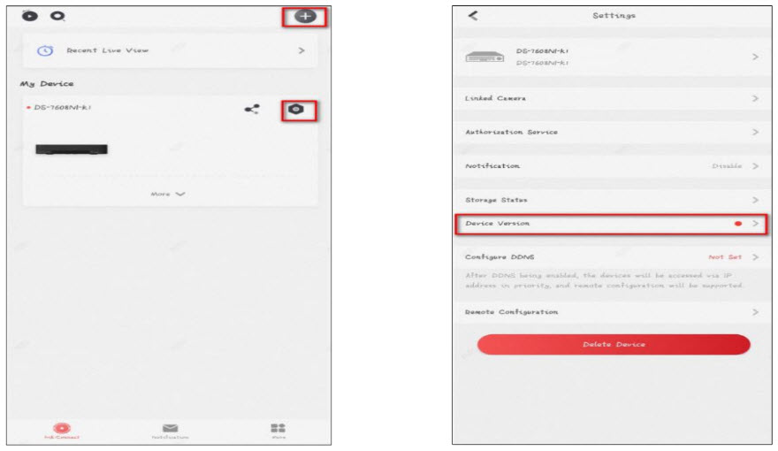 - 1. Thêm thiết bị vào Hik-Connect và nhấp vào biểu tượng cài đặt thiết bị, sau đó nhập Phiên bản thiết bị