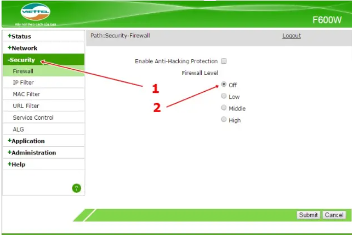 - Sau khi đăng nhập thành công, tiến hành tắt Firewall của modem mới có thể NAT Port thành công. Vào Menu > Security > Firewall > chọn Off > nhấn Submit.