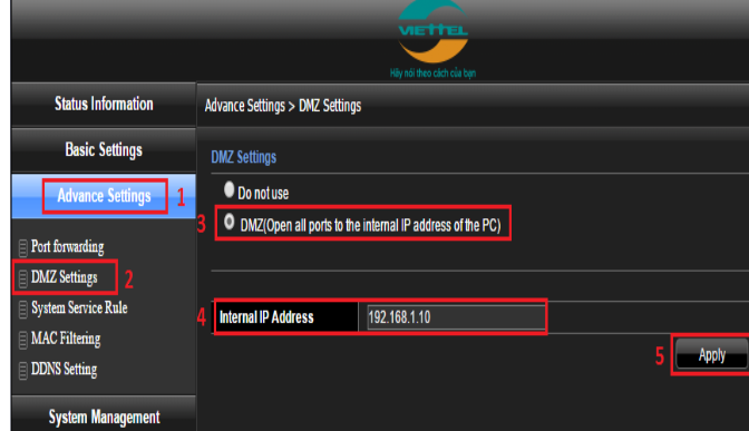 - Advance Settings => DMZ Settings => DMZ => Nhập địa chỉ IP cần mở Port => Apply