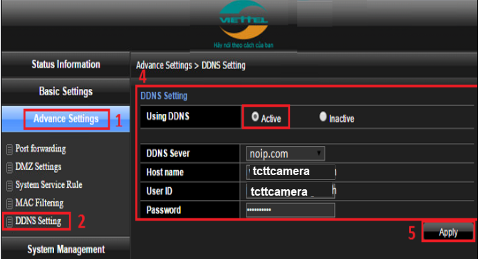 Vào mục Advance Settings => DDNS Setting => Nhập vào thông tin => Apply