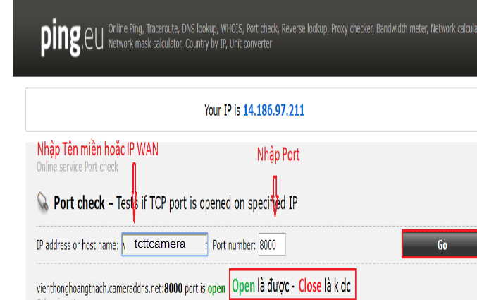 Bước 3: Test kiểm tra port chúng ta vào trang canyouseeme.org hoặc Vào trang https://ping.eu/port-chk/ để thử lại xem port đã thông hay chưa với cả địa chỉ IP WAN và tên miền