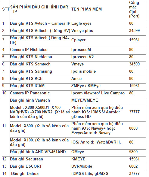 - Dòng Avtech chỉ duy nhất 1 cổng 80 dùng phần mềm EagleEyes. Khi bạn biết được số cổng bạn hãy tra cứu với bảng phần mềm dưới đây bạn sẽ tìm ra được phần mềm để cài đặt cho điện thoại của mình.