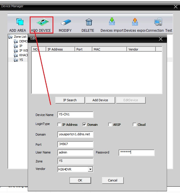 - Domain Name: (tên tùy ý, ở đây mình để là "Công ty" ) Domain: Tên miền xem camera từ xa được cấu hình trên modem mạng do đơn vị lắp đặt camera hoặc NSX cung cấp (nếu bạn chưa có tên miền vui lòng xem tại đây ) Port: Cổng của đầu ghi hình được mở/ NAT Port trên modem dành cho phần mềm User Name: tài khoản đăng nhập vào đầu ghi hình, thông thường là: admin/hoặc tài khoản được cấp riêng cho từng quản lý Password: Mật khẩu đăng nhập vào đầu ghi hình do NSX thiết lập hoặc được cấp riêng cho quản lý.