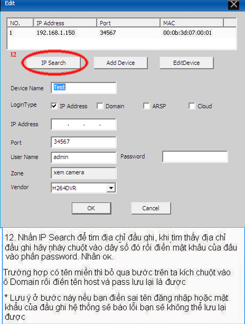 A: Trường hợp thứ nhất : là máy tính của bạn đang sử dụng chung mạng mới đầu ghi hình camera quan sát bạn chọn dòng IP Search, đợi vài giây địa chỉ đầu ghi sẽ hiện ra nháy chuột vào địa chỉ đó dòng IP Address sẽ tự động cập nhật, sau đó điền tên đăng nhập vào phần User Name mặc định là (admin) điền mật khẩu vào ô Password nhấn OK = OK