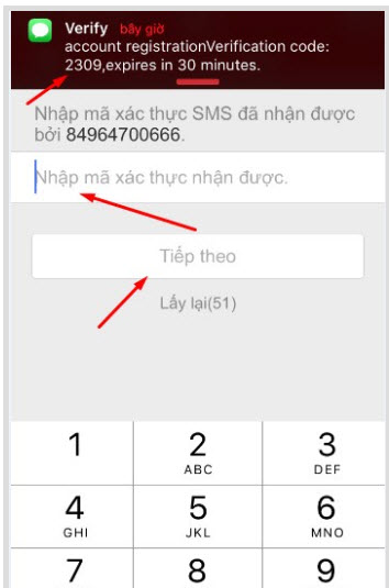 - Sau đó bạn sẽ nhận được một tin nhắn vào số điện thoại bạn đã đăng kí. Như các bạn thấy mình nhận được tin nhắn có dạng như sau: “account registration Verification code: 2309,expires in 30 minutes.” ==> nhập ngay mã số vào thôi ==> nhấn tiếp theo.