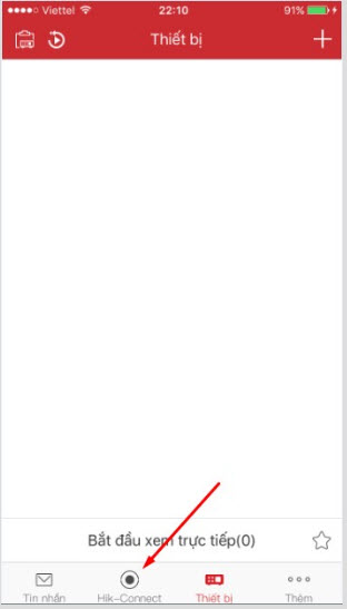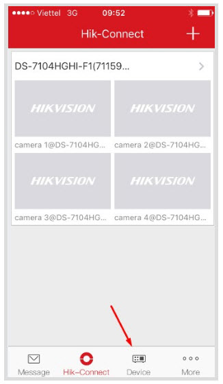- Chúng ta quay lại trên điện thoại và mở lại phần mềm hik-connect chúng ta chuyển sang mục Device (Thiết bị) trên phần mềm. Bình thường mở phần mềm lên nó sẽ đưa thẳng chúng ta vào mục P2P