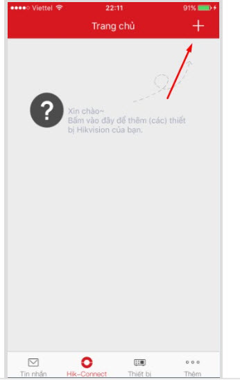 - Sau khi đăng nhập xong nó sẽ đưa các bạn vào trang chủ của hik-connect. Các bạn bấm vào dấu + để thêm các thiết bị của hikvision vào. Sau khi nhấn vào nó sẽ hiện ra một bảng quét mã vạch. Chúng ta sẽ tìm đến mã vạch của đầu ghi hình hikvision hoặc camera ip.