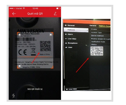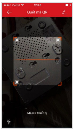 - Màn hình quét mã QR xuất hiện. Chúng ta di chuyển camera của chúng ta tới mã QR để quét mã số thiết bị.