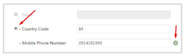 - Mobile Phone Number: Điền số điện thoại của bạn. Sau khi điền xong có dấu tích màu xanh ở cuối tức là số điện thoại hợp lệ.