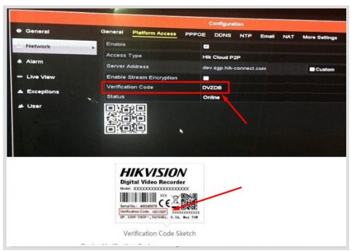- Mã xác thực ta có thể lấy ở dưới đáy đầu ghi hình hoặc camera ip, mục Verification Code:
