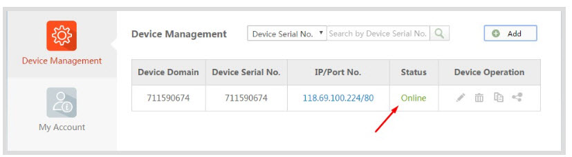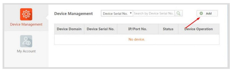 - Chúng ta đăng nhập vào trang chủ hik-connect.com. Mặc định trang web sẽ đưa chúng ta vào mục quản lý thiết bị. Chúng ta nhấn vào nút Add để thêm thiết bị.