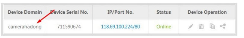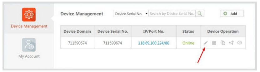 - Đăng nhập vào giao diện chính của trang hik-connect.com. Chúng ta thấy một dòng thiết bị. Kích vào biểu tượng cái bút để sửa.