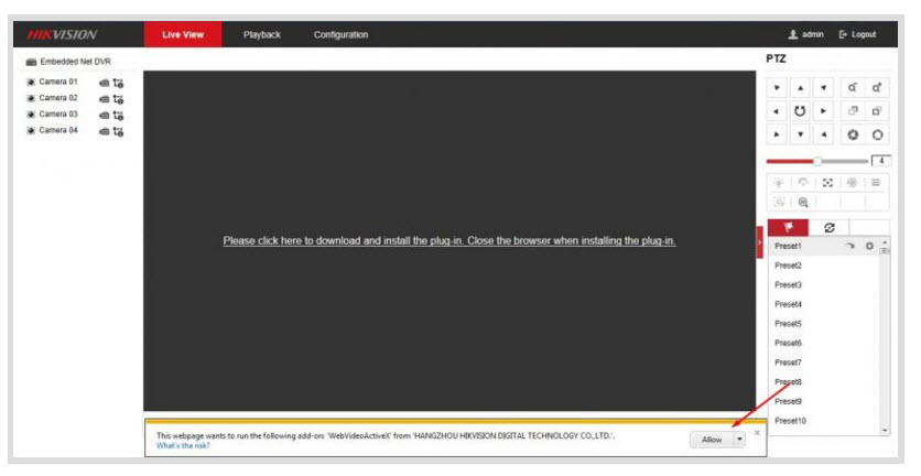 - Sau khi cài chúng ta tải lại trang và sẽ có một dòng hỏi “Trang này muốn chạy một add on WebvideoActiveX từ Hikvision” Chúng ta nhấn vào Allow để đồng ý cho nó chạy Một số trình duyệt IE đời cũ hơn nó sẽ hiện dòng hỏi này ở phía trên trình duyệt.