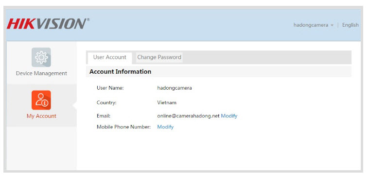 - Nó sẽ đưa ta vào ô thông tin tài khoản nếu ta đăng kí thành công. Đến bước này là chúng ta đã đăng kí thành công tài khoản hik-connect.