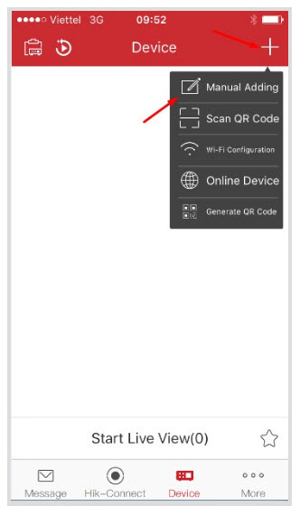 - Trong mục Device (Thiết bị) chúng ta nhấp vào dấu + trên cùng và chọn Manual Adding (Gán thủ công) đê thêm một thiết bị mới vào điện thoại của bạn.