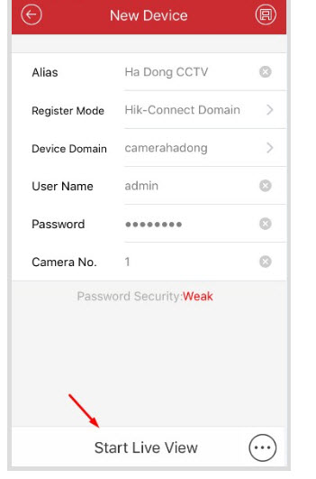 - Lưu xong nếu Ok nó sẽ hiện độ an toàn mật khẩu bên dưới. “Password Secutity: Weak“. Xong chúng ta nhấn Start Live View để xem