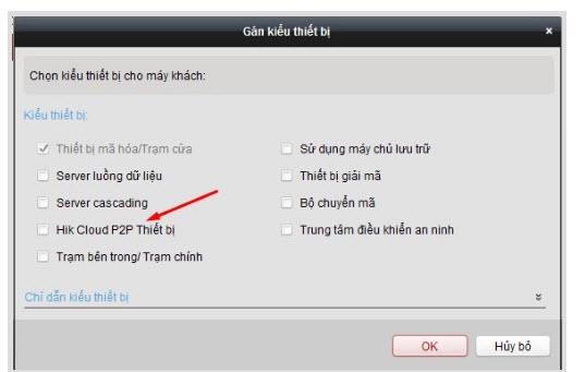 - Tiếp đến chúng ta sẽ chọn kiểu Hik Cloud P2P Thiết bị. Chúng ta tích vào đó và nhấn OK bên dưới.