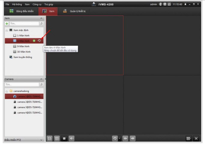 - Chọn màn hình muốn xem rồi nhấn vào nút vòng tròn. Ví dụ mình muốn xem 4 ô chúng ta sẽ kích vào ô 4 màn hình rồi kích đúp vào nút cuối đó.