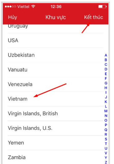 - Sau khi đăng kí bằng sđt nó sẽ bắt chúng ta chọn vùng miền. Chúng ta kéo xuống dưới và chọn Vietnam