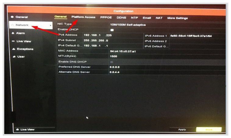 - Giao diện chính của mục Configuration chúng ta chọn và mục Netwwork -> Platform Access để vào trong mục cài đặt của hik-connect.