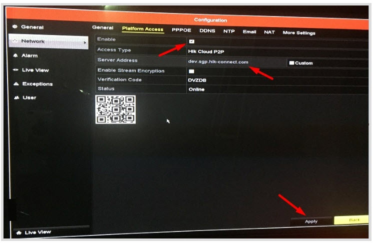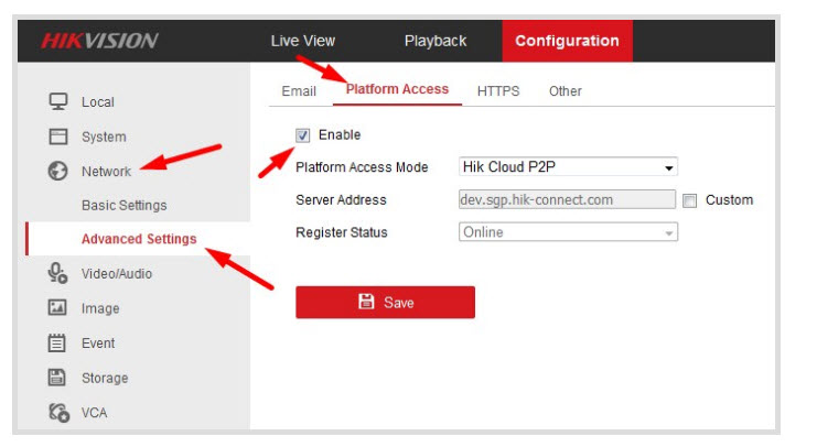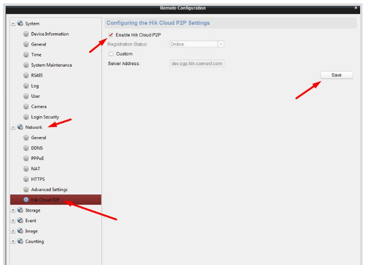 - Vào mục Network ==> Vào mục Hik cloud P2P ==> Chọn tích vào ô Enble Hik Cloud P2P ==> Save lại